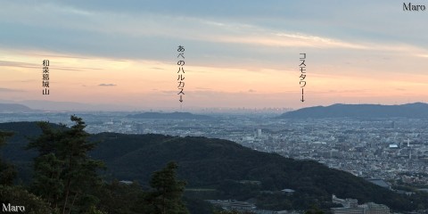 大文字山の火床から「あべのハルカス」、雲山峰を望む。