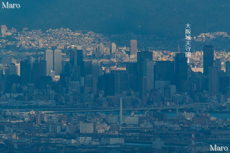 菊水山から生駒山、大阪城、大阪の高層ビル群(ビル街)を望む。