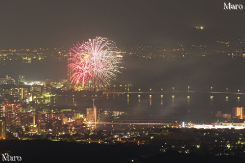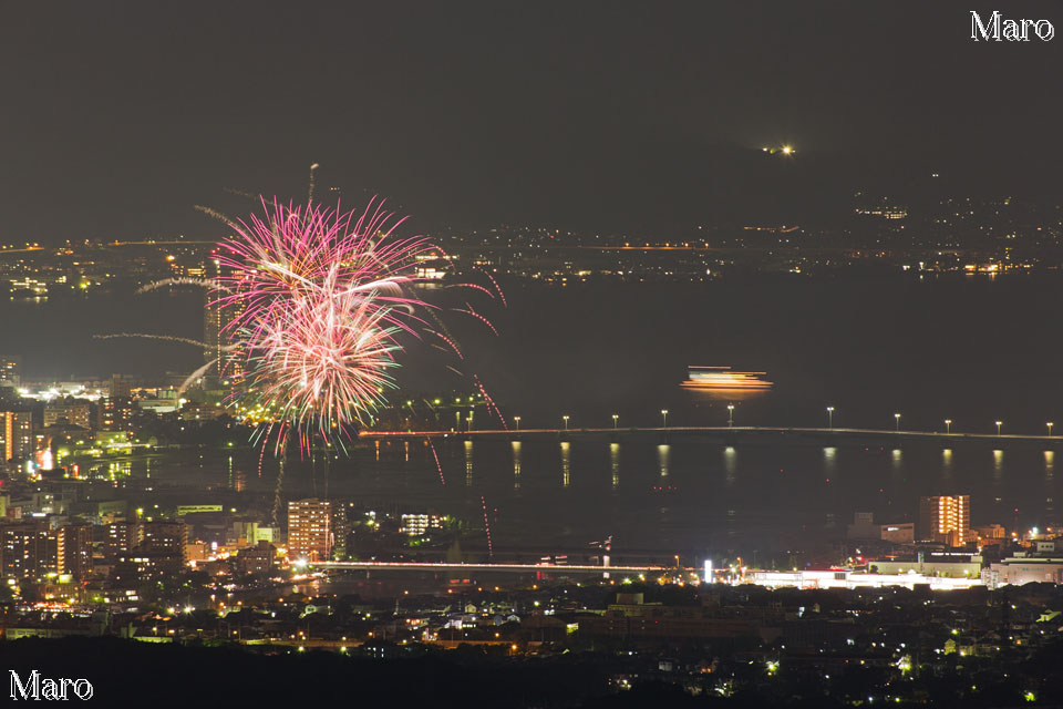 霞んでいるのが難点ですが、琵琶湖や近江大橋などが重なることもあり、打ち上げ花火の構図としては悪くないように思えます。
