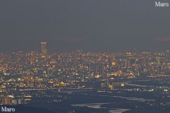 大文字山の山頂(三角点)から「あべのハルカス」全面開業カウントダウン「97」を遠望する。