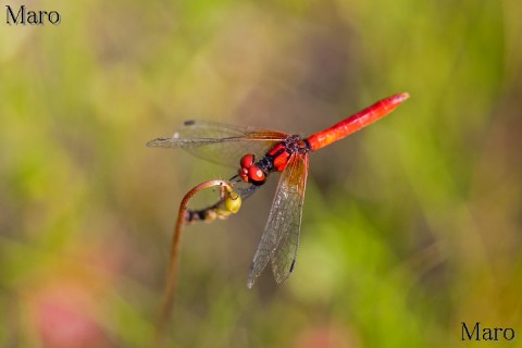 やや分かりにくですが、写真中央の赤いのがハッチョウトンボです。