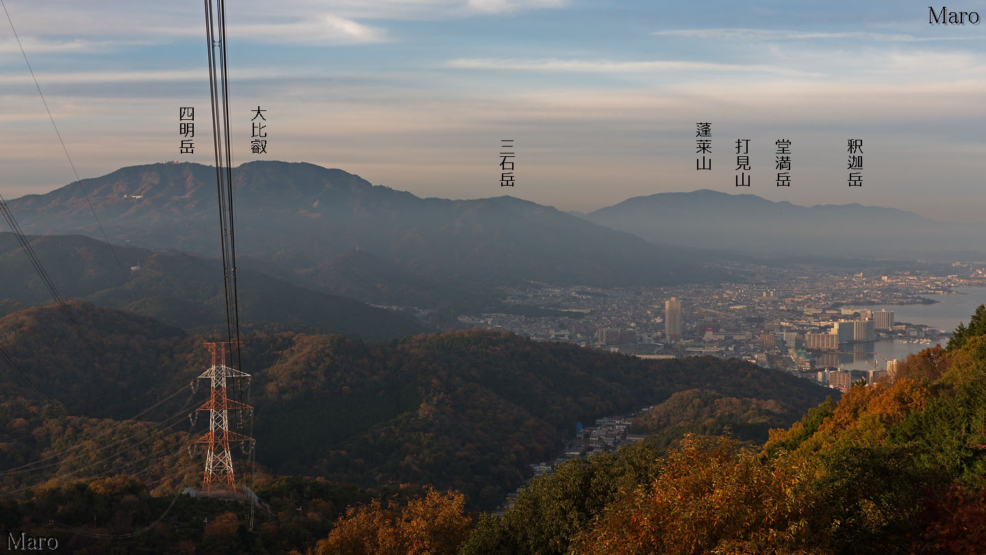 余談ながら、大津港で行われる花火大会(びわ湖大花火大会)も、この構図の右端ぎりぎりに眺めることができ、若干とはいえ、これは山頂の北の展望地(東海自然歩道上の展望地)から見るより近くに感じることができます。