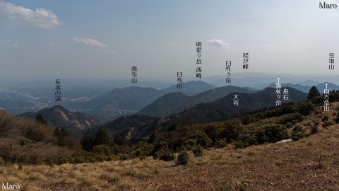 ミズナシから家老平、長坂の頭、臼杵山、新名神高速道路を望む。