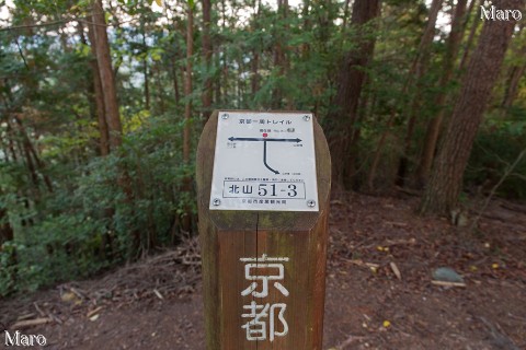 地理院地図では破線路すら山頂まで通じていませんが、地権者さんらの協力もあって、京都一周トレイル北山コースの派生路にも組み込まれており、今では容易に登頂できる山です。