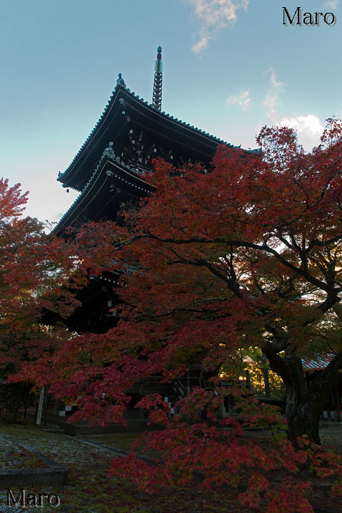夕暮れ時の真如堂さん(真正極楽寺)。三重塔と紅葉越しに望む夕日。