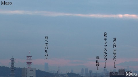 ハルカスさんだけではなく、上部のみとはいえOBPビル群も見えており、OBPキャッスルタワーの左遠方には雲山峰の山頂がわずかに写っています。