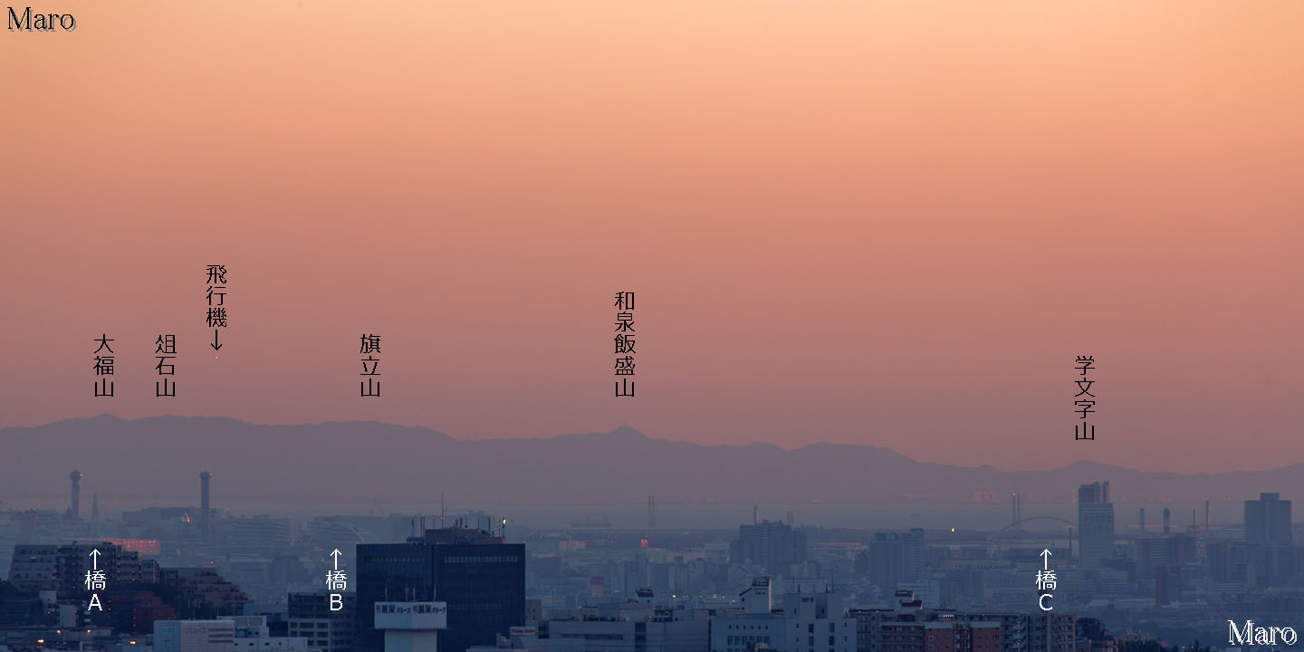 前回までの記事でお分かりいただけるように、この日は空気が澄んだ好条件の日だったため、まだ空が明るさを残している黄昏時であれば、遠くの和泉山脈と併せてライトアップを撮影できたでしょう。