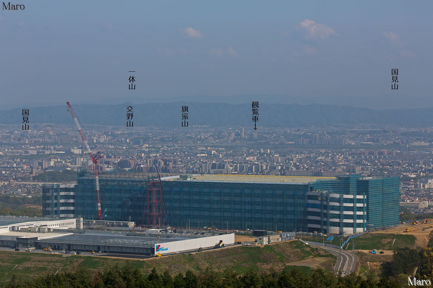 昨年10月や今年1月に箕面市側の彩都なないろ公園から見た時は、建設工事に伴い大型クレーン群が林立していましたが、今回、鉢伏山から眺めてみたら、すでに大型クレーンは1基だけとなっていました。