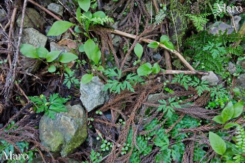 ハイキングコースの反対側の湿った岩場をよく探してみると、こちらには若いイチリンソウの葉が多く見られましたが、やはりお花を付けていません。