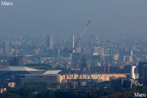 吹田のエキスポシティで建設中のオオサカホイールを箕面と茨木に跨る彩都から遠望する。2016年4月撮影。