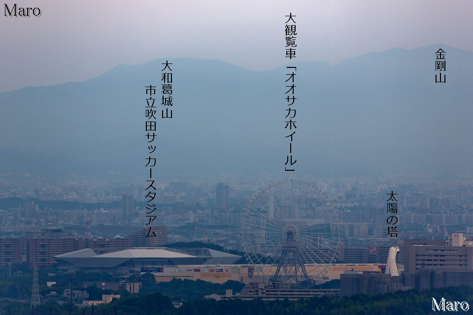 観覧車やエキスポシティのの左後方に市立吹田サッカースタジアム(→パナソニックスタジアム吹田)が、右手前に万博記念公園の「太陽の塔」が写っていますが、暗くて分かりにくいでしょうか。