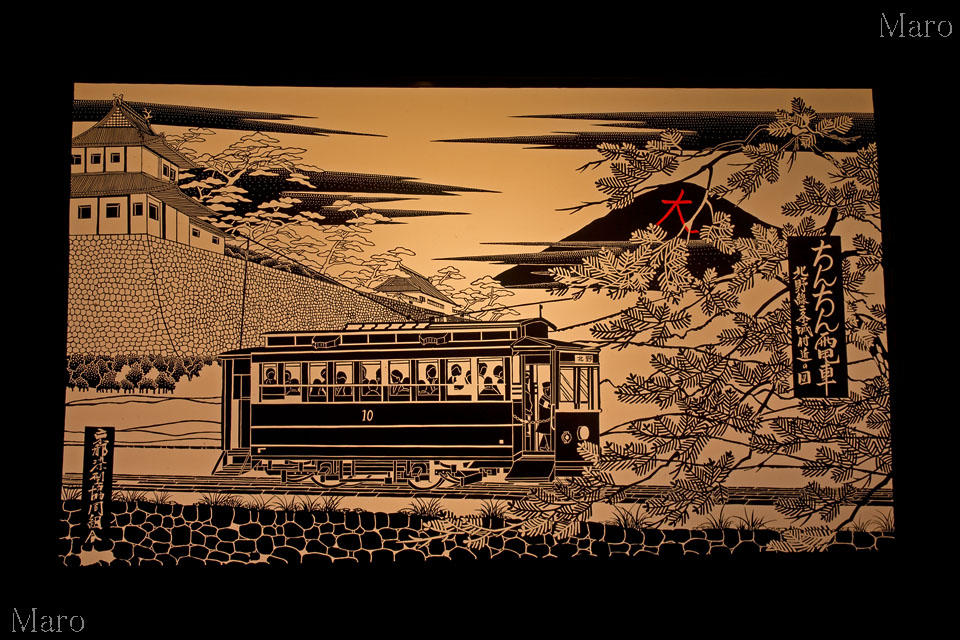 「ちんちん電車 北野線二条城付近の図」に見る大文字山の送り火。「京の七夕」堀川会場にて。