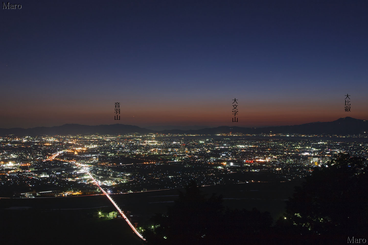 字が重なるため示していませんが、大比叡の左には四明岳も写っており、山上の施設が明るく光っています。