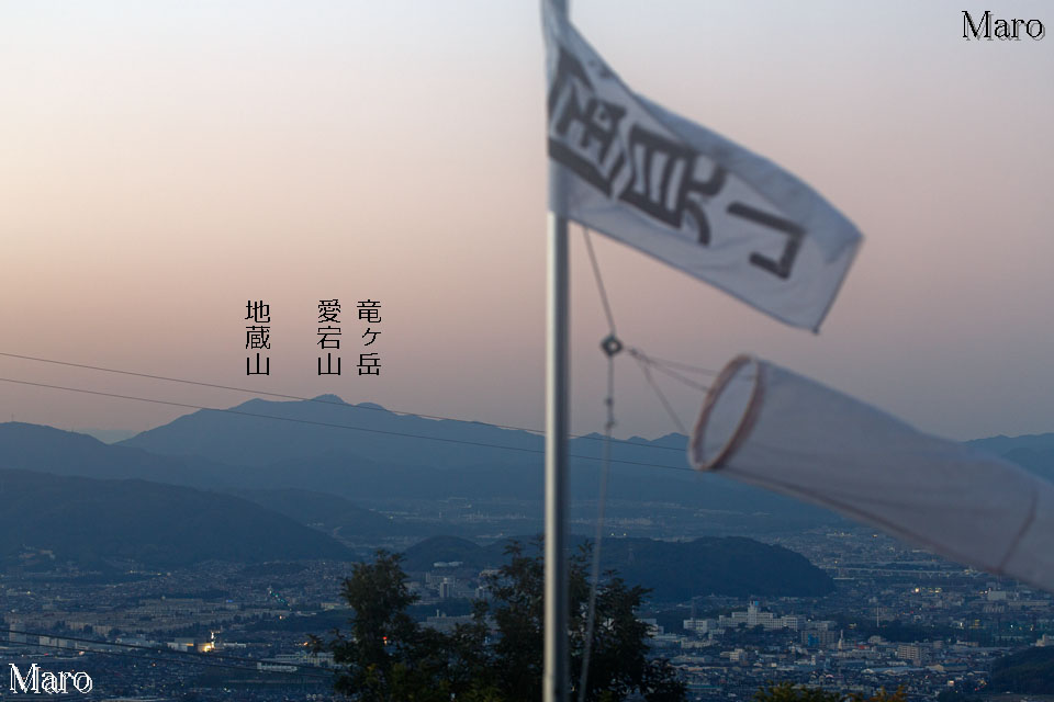国見山の山名旗越しに愛宕山、鳩ヶ峰(男山)や天王山を望む。大阪府枚方市。